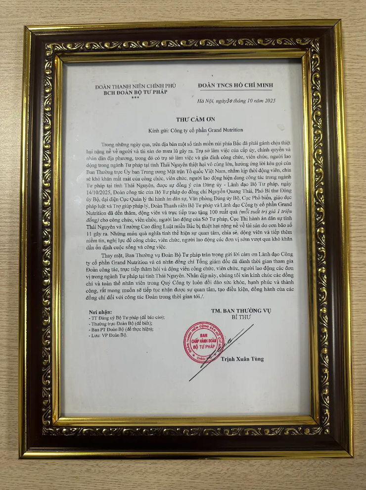 Grand Nutrition xúc động khi nhận thư cảm ơn của Bộ Tư Pháp.