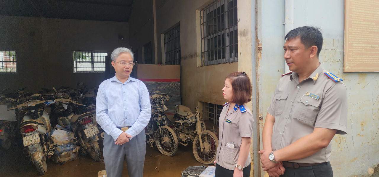 Ông Nguyễn Quang Thái, Phó Bí thư chuyên trách Đảng ủy Bộ Tư pháp gấp rút kiểm tra thiệt hại thực tế và đưa ra